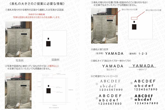 お問い合わせいただきましたら、ご提案に必要な表札を取り付ける場所の情報をご用意して頂くためのご案内をさせて頂きます。